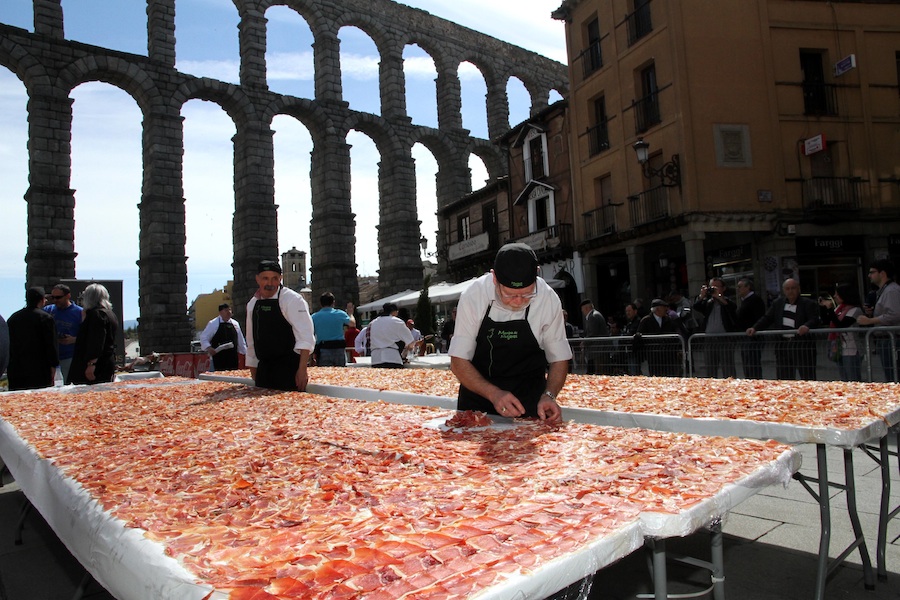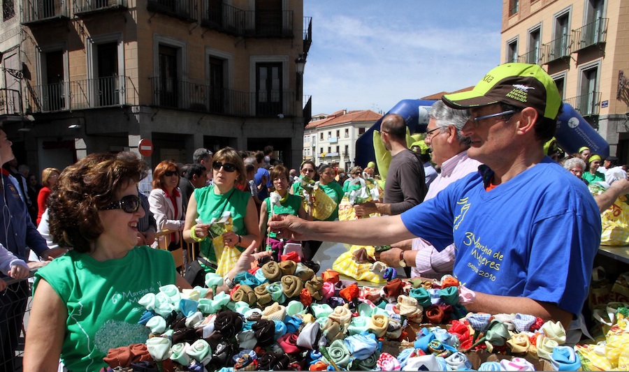 A los pies del Acueducto romano el sabor de 126 kilos de jamón esperaba a las féminas gracias a la colaboración de Hacienda Vargas y a los 19 cortadores de jamón de la Asociación de Cocineros de Segovia al que incluso se sumó un cortador abulense desde las 9 de la mañana. Además, las participantes recibieron una flor hecha con tela y productos alimenticios que las participantes podrán donar al Banco de Alimentos de Segovia. Junto a esta entidad, la marcha dedicará sus ganancias a la Coordinadora de Minusválidos de Segovia.
