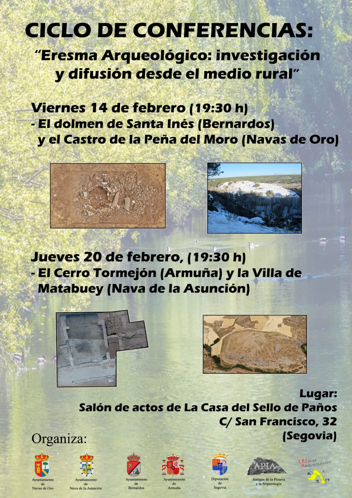 Las conferencias tendrán lugar a las 7:30 de la tarde, en la Casa del Sello de Paños, en la calle San Francisco de Segovia y correrán a cargo del director del proyecto «Eresma Arqueológico», Raúl Martín Vela y de Francisco Gozalo Viejo, colaborador en el mismo.