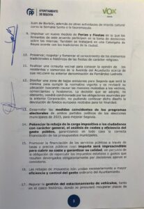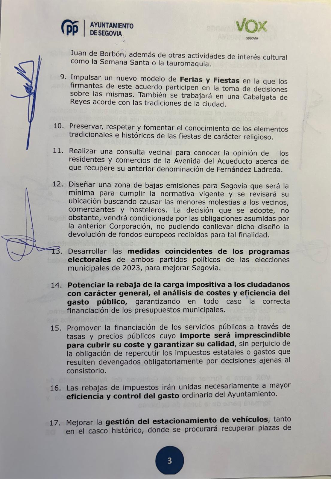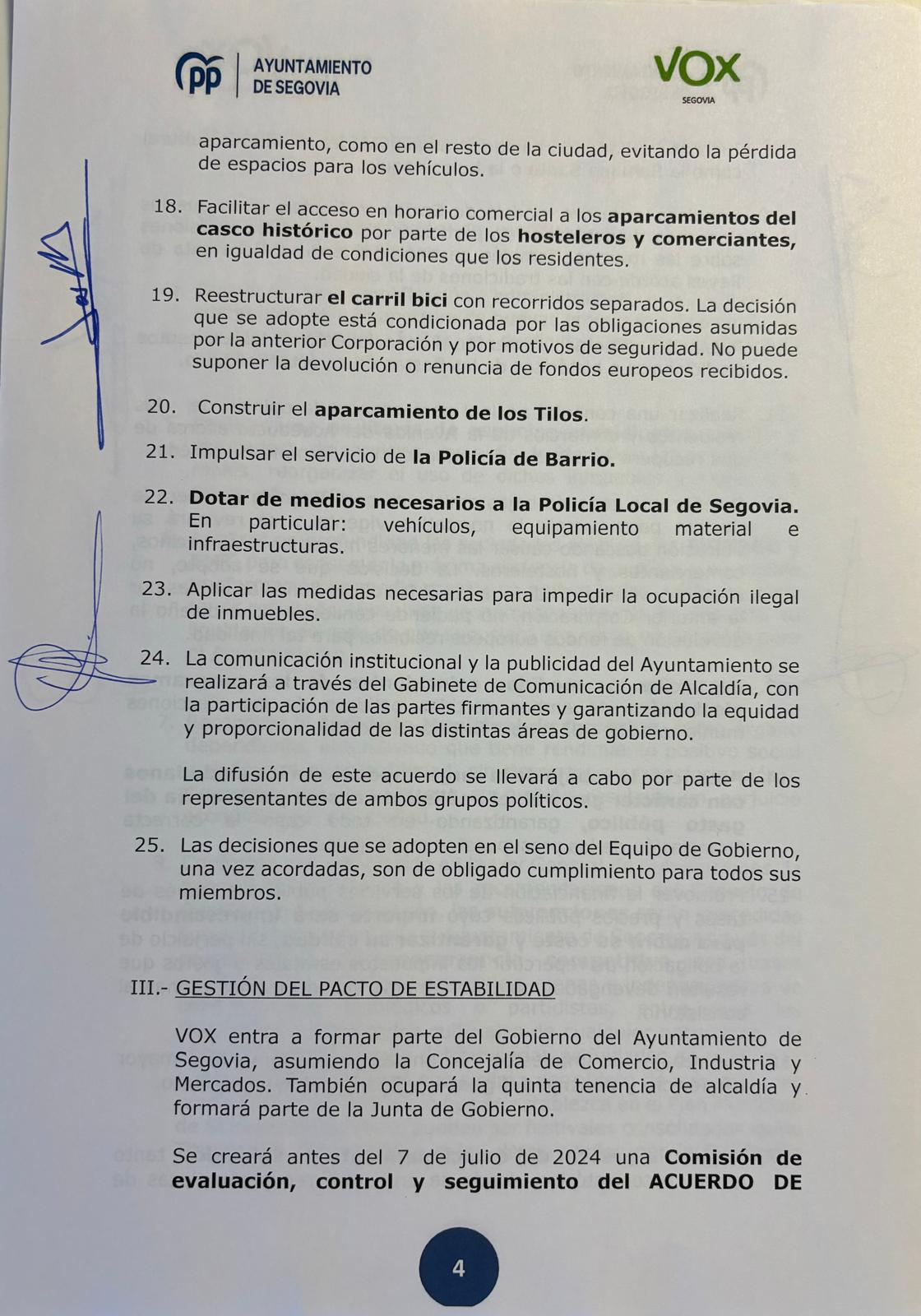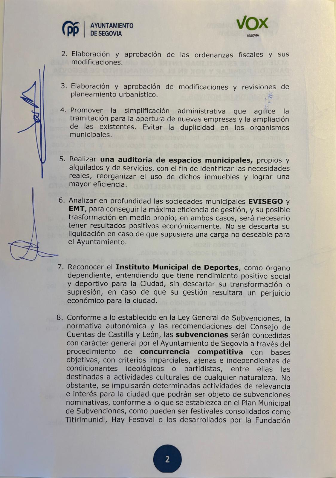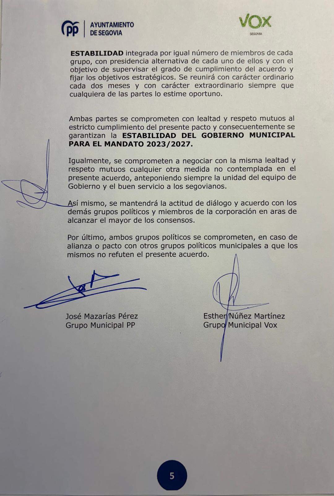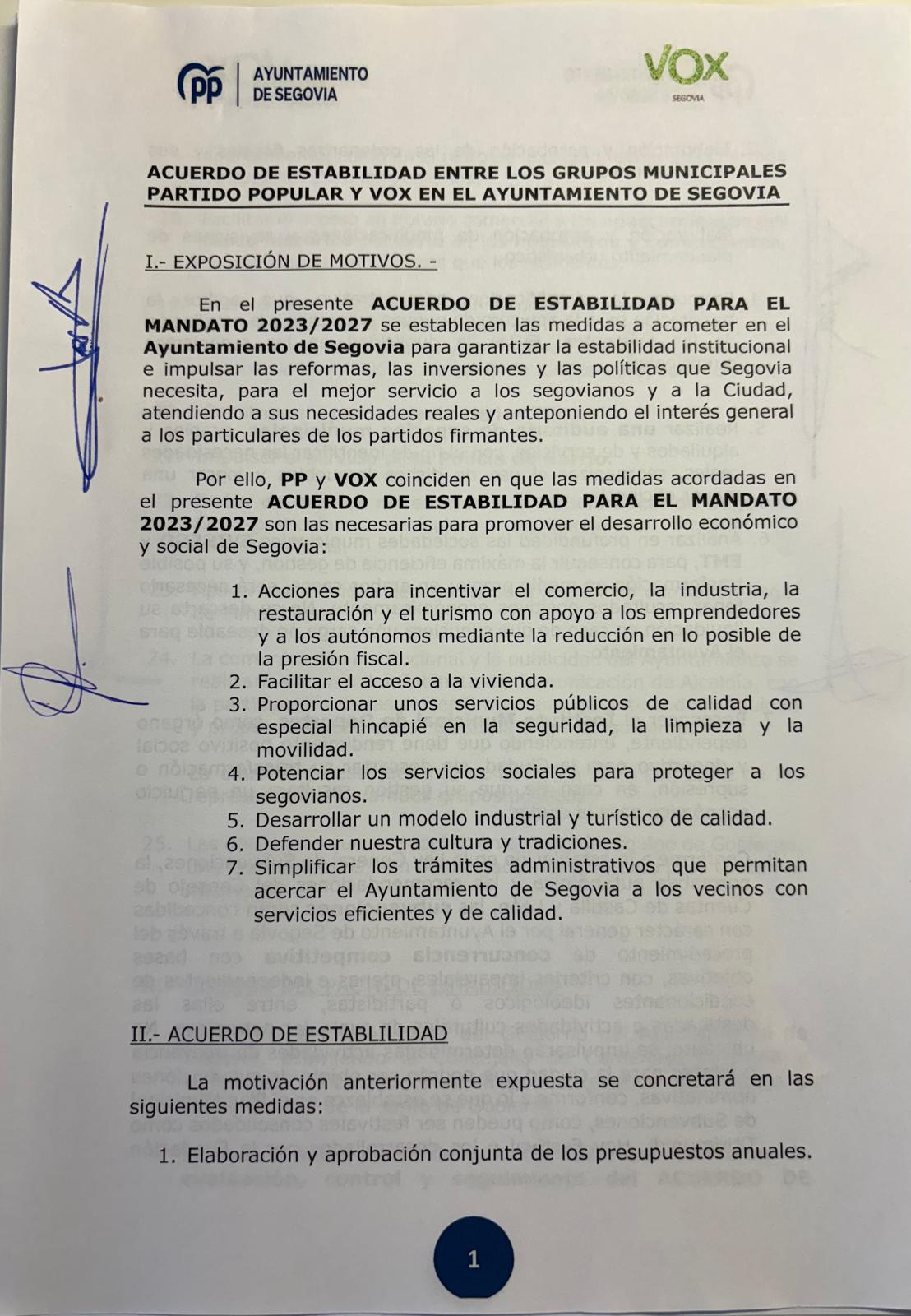 Este es el acuerdo completo firmado por el PP y Vox en el Ayuntamiento de Segovia