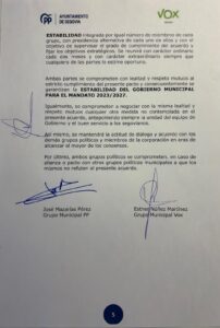 El jueves por la tarde una convocatoria de Vox encendía todas las alarmas. Convocaban a la prensa para explicar el acuerdo de Gobierno firmado entre el Partido Popular y VOX. Una rueda de prensa que finalmente se efectuó en solitario, por parte de la portavoz municipal de VOX, Esther Nuñez, quien mostró el acuerdo, ahora enviado a los medios de comunicación. Las reacciones no se han hecho esperar, también la del PP que asegura que los cauces de diálogo continúan abiertos, obviando la existencia de este acuerdo y a la formación verde.