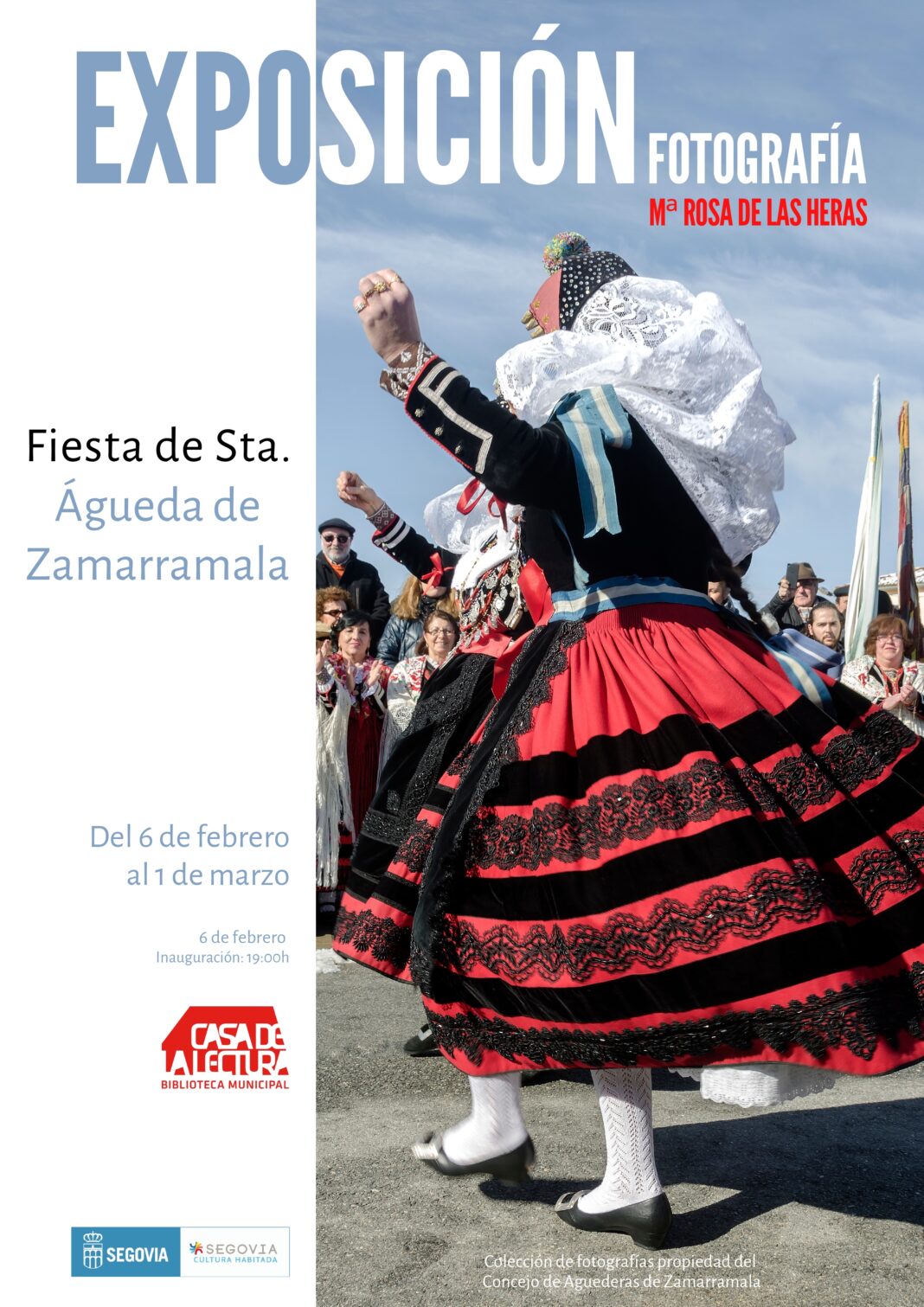 Se inaugura en la Casa de la Lectura-Biblioteca Municipal de Segovia la exposición de fotografía Fiesta de Santa Águeda de Zamarramala, con imágenes captadas durante la celebración de esta festividad en los años 2016, 2017 y 2018 por la fotógrafa Mª Rosa de las Heras. A la inauguración de la exposición acuden la concejala de Cultura de Segovia, Gina Aguiar, la autora, representantes del Concejo de Aguederas de Zamarramala, propietarias de las fotografías, y las alcaldesas de este año, Mónica Martín y Yolanda Cubero. El barrio incorporado de Zamarramala está en estos días organizando los actos festivos en honor a Santa Águeda, que tendrán lugar del 8 al 10 de febrero.