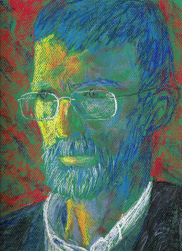 Jesús Mazariegos también tenía una potente vena creativa y esa faceta se tradujo tanto en su obra plástica (a la izquierda, su autorretrato) como en su afán por recopilar imágenes de la historia del arte. Justamente sobre eso trató su última exposición, Santos Reciclados, que se celebró a principios de año en La Alhóndiga. En esa muestra, que en cierto modo era un resumen de su vida docente y de pasión por el arte, Mazariegos realizaba un auténtico recorrido por el arte de toda la Historia, a través de 6000 imágenes distribuidas por épocas y por estilos.