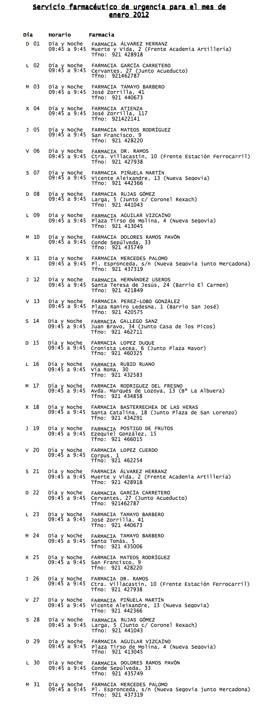Consulta las Farmacias de guardia de Cuéllar, El Espinar/ San Rafael y Segovia Rural en este link.