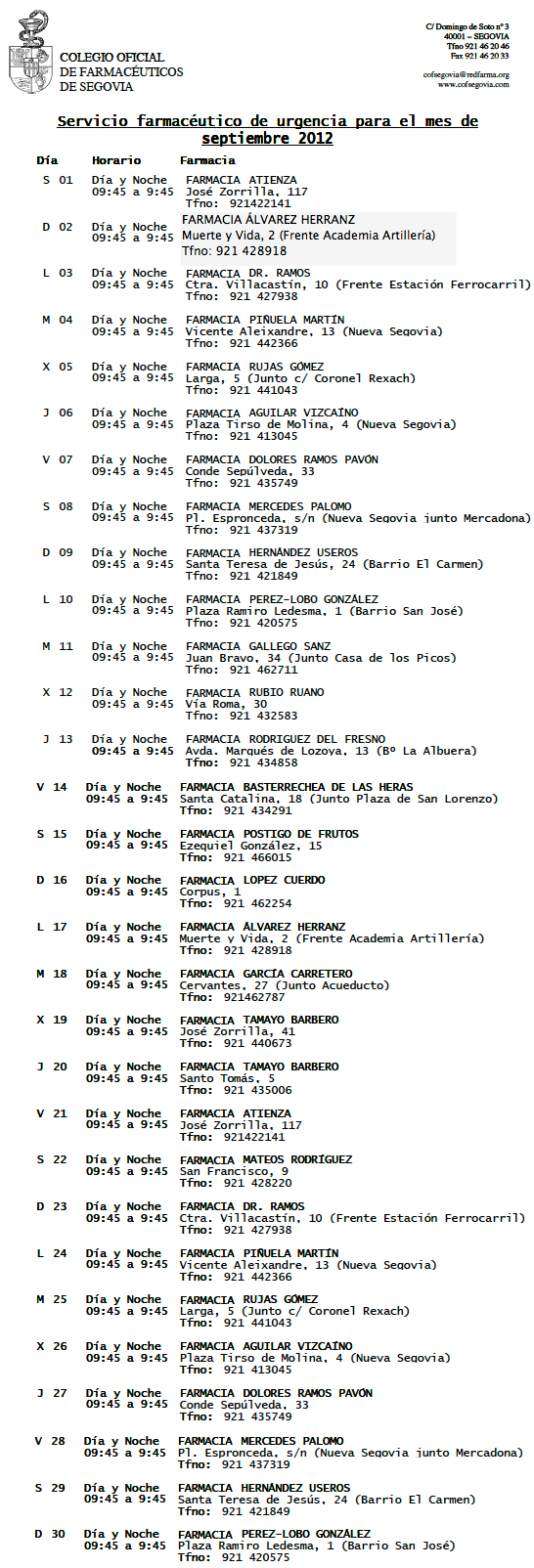 Consulta las Farmacias de guardia de Cuéllar, El Espinar/ San Rafael y Segovia Rural en este link.
