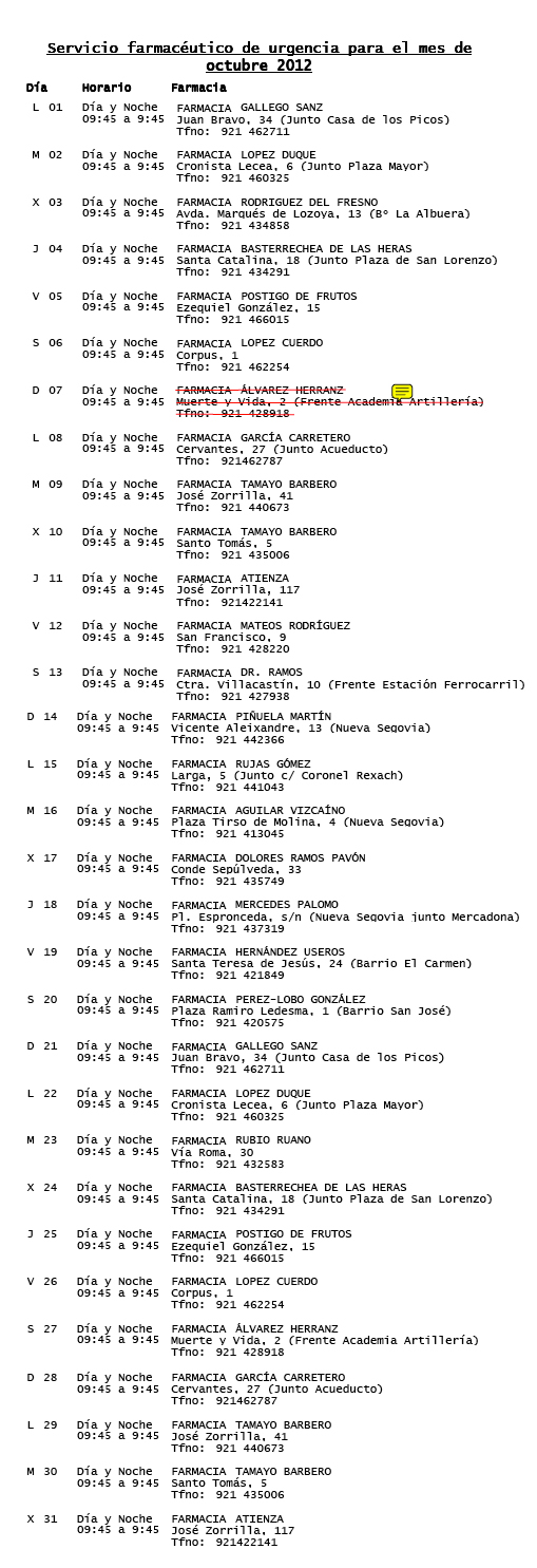 Consulta las Farmacias de guardia de Cuéllar, El Espinar/ San Rafael y Segovia Rural en este link.