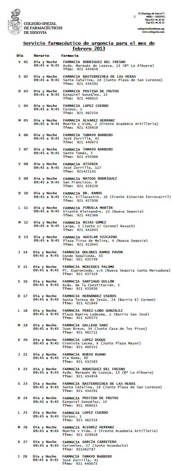 Consulta las Farmacias de guardia de Cuéllar, El Espinar/ San Rafael y Segovia Rural en este link.