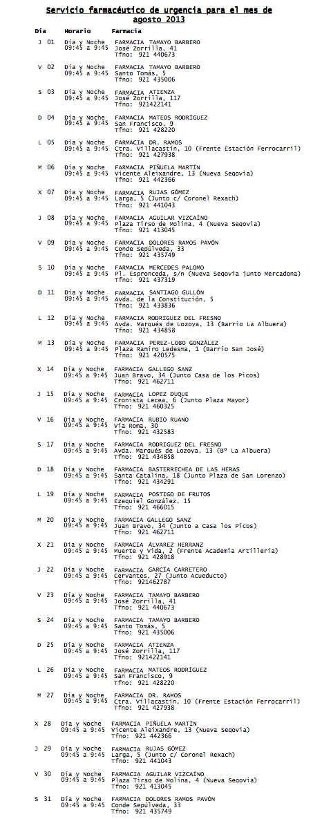 Registrarse ¡Bienvenido! Ingresa en tu cuenta tu nombre de usuario tu contraseña ¿Olvidaste tu contraseña? consigue ayuda Recuperación de contraseña Recupera tu contraseña tu correo electrónico Se te ha enviado una contraseña por correo electrónico. Farmacias de guardia Fecha: 8 de septiembre de 2013 Compartir: FacebookXPinterestWhatsApp Consulta las Farmacias de guardia de Cuéllar, El Espinar/ San Rafael y Segovia Rural en este link. TagsColegio de Farmaceuticos de Segoviadiario digital de Segoviafarmaciasfarmacias de guardiafarmacias el dia de reyesfarmacias en navidadfarmacias en nochebuenafarmacias en nocheviejafarmacias en Segoviaguardias en Segoviasegoviaudaz Artículo anteriorSegovia acogerá un programa pionero para favorecer la unión entre padres e hijosArtículo siguienteDe la tiza a la pizarra digital Corte de agua y de tráfico en la calle Santa María la Real de Nieva Está pasando La Feria del Ganado Vacuno llega a El Espinar Está pasando Avances y resultados de las inversiones de la Diputación en cuatro pueblos de Segovia Está pasando Seis días de surf en Somo (Cantabria) para jóvenes y adultos de la provincia Deportes Aves rapaces, charanga y comida popular en la Feria del Esquileo de Trescasas Está pasando Publicidad Artículos Relacionados En portada Aviso amarillo en Segovia por lluvias y tormentas este miércoles El cielo volverá a complicarse esta semana en la provincia de Segovia. La Agencia Estatal de Meteorología ha... Está pasando Corte de agua y de tráfico en la calle Santa María la Real de Nieva Esta noche se ha producido un reventón en una tubería de la red de distribución de agua en... Está pasando La Feria del Ganado Vacuno llega a El Espinar Del 1 al 3 de Mayo el Espinar celebrará la Feria del Ganado Vacuno en la Plaza de... Está pasando Avances y resultados de las inversiones de la Diputación en cuatro pueblos de Segovia Miguel Ángel de Vicente, presidente de la Diputación de Segovia, ha visitado cuatro pueblos de la provincia para...