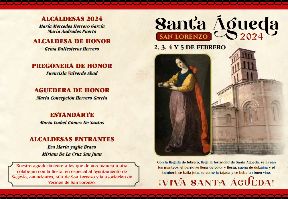 El Barrio de San Lorenzo te invita del 2 al 5 de febrero a la festividad de Santa Águeda, a continuación te mostramos cual es programa de actividades y quienes son las alcaldesas, pregonera y estandarte del 2024.