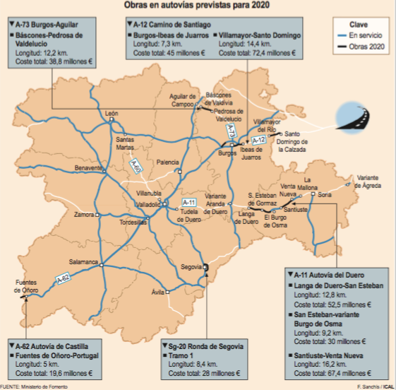El calendario de Fomento para 2020 incluye la entrada en servicio de entre tres o cuatro tramos de la Autovía del Duero, todos en Soria, así como el que está pendiente de la ronda de Segovia (SG-20) y el tramo concluido de la Autovía de Castilla (A-62) en Fuentes de Oñoro (Salamanca), pero no inaugurado por el estado de las obras en territorio portugués, lo que impide el enlace completo con la IP-5.