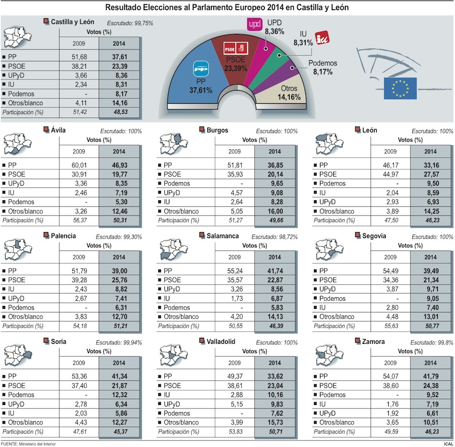 Este hecho se traduce en subidas destacadas en UPyD (pasa del 3,66 por ciento de 2009 a un 8,36 por ciento con 79.615 votos), IUCyL (de un 2,34 a un 8,32 por ciento, con 79.179) y en la candidatura ‘Podemos’ que irrumpe en sus primeros comicios con el 8,17 por ciento, lo que se traduce en 77.779 apoyos. Estas tres fuerzas minoritarias acumulan en Castilla y León el apoyo de la cuarta parte de los que acudieron hoy a las urnas, en concreto, del 24,85 por ciento, con el 99,08 por ciento de los votos escrutados.