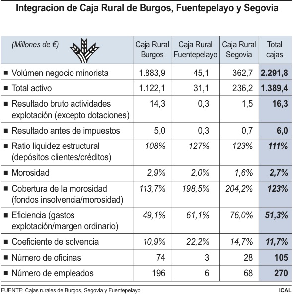 Las cajas rurales de Burgos, Segovia y Fuentepelayo han alcanzado un acuerdo de integración por lo que inician un proceso que culminará en mayo, cuando la nueva cooperativa de crédito comenzará a operar en cuatro provincias de Castilla y León, La Rioja y Cantabria para, después, en breve, hacerlo en Valladolid. El Banco de España aprueba esta operación “voluntaria” y “complementaria”, que mantendrá los empleos y la red de oficinas y fijará en la capital burgalesa su sede operativa y en la segoviana la social.