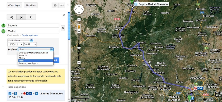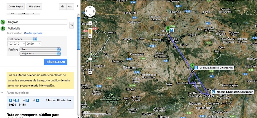 En el caso de Segovia, tanto hacia Madrid, Google solo reconoce la linea de Cercanías, y se olvida de la Alta Velocidad, mostrando un recorrido que supera las 2 horas y media. Lo mismo pasa en el camino hacia Valladolid en la que la operadora nos manda a la capital madrileña en primer lugar, desde dónde nos lleva a la capital del Pisuerga, en un trayecto que llega a las 4 horas.