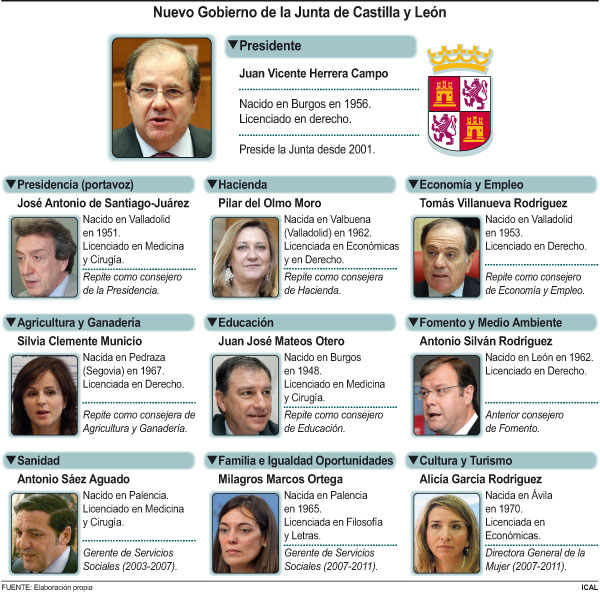 El presidente de la Junta, Juan Vicente Herrera, desveló el nombre de los consejeros tras la toma de posesión en la sede de las Cortes, en un equipo más reducido del que salen María Jesús Ruiz, vicepresidenta primera y consejera de Medio Ambiente; Francisco Javier Álvarez Guisasola, en Sanidad; César Antón, en Familia, y María José Salgueiro, en Cultura y Turismo.