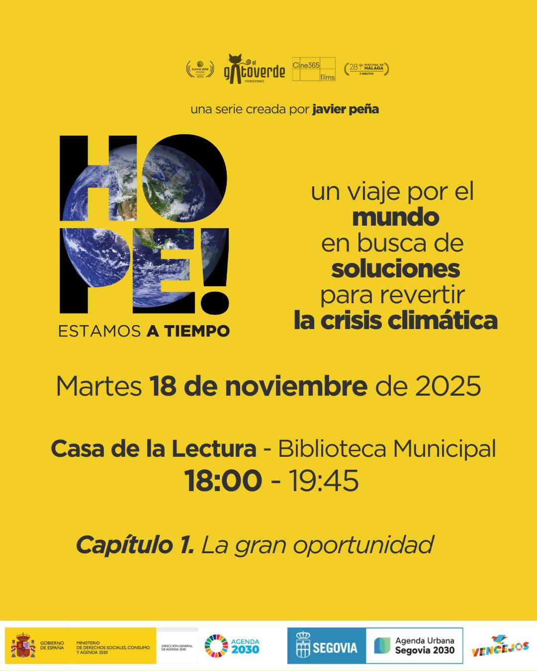 El Ayuntamiento de Segovia, a través de las áreas de Educación y Juventud y Agenda Urbana y Fondos Europeos, impulsa la proyección de la serie documental ‘Hope, estamos a tiempo’. Esta tiene el objetivo de fomentar la reflexión y el debate ciudadano en torno a las soluciones frente a la crisis climática.