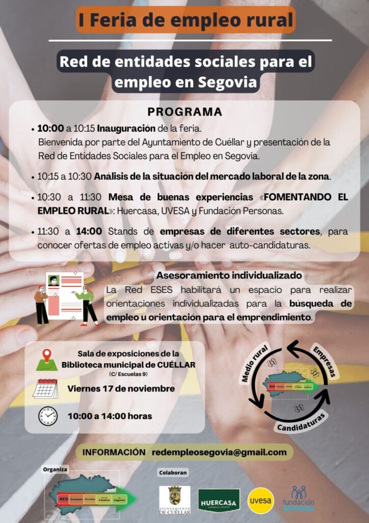 La cita con la I Feria de Empleo Rural en Segovia es el 17 de noviembre, de 10:00 a 14:00 horas, en la Sala de Exposiciones de la Biblioteca Municipal de Cuéllar.