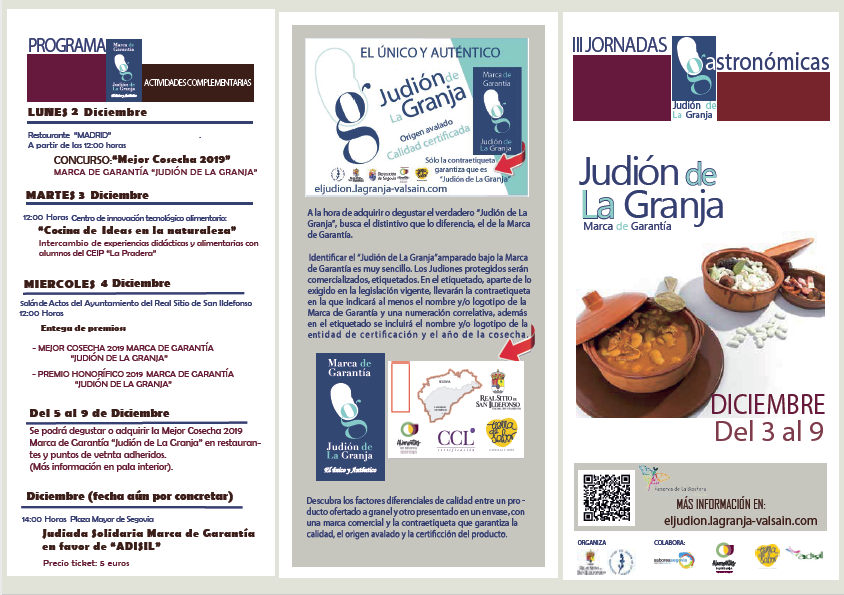 Con este objetivo común, el Ayuntamiento del Real Sitio de San Ildefonso y la Asociación “Tutor del Judión de La Granja”, celebran desde el 3 al 9 de Diciembre, las III JORNADAS GASTRONÓMICAS, donde se promociona la Marca de Garantía, eleva el consumo y conocimiento de la variedad autóctona y la excelencia de sus cualidades diferenciales.