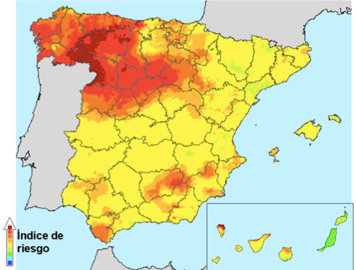 El índice de riesgo de incendios forestales estos día es moderado en el país, presentando este riesgo valores más elevados en la confluencia de las provincias de Orense, Zamora, León y Lugo, así como en algunas zonas de Valladolid, Asturias; y el norte de la isla de La Palma.