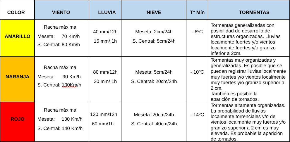 Conviene que recordar que los valores umbral de referencia para los avisos correspondientes a la provincia de Segovia son: