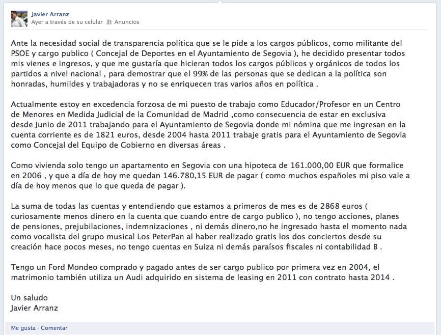 El concejal socialista en el Ayuntamiento de Segovia Javier Arranz ha utilizado la red social Facebook para exigir transparencia a los cargos públicos y orgánicos de todos los partidos a nivel nacional y ha utilizado su cuenta en esta red social para publicar sus bienes e ingresos. Según considera, sólo publicando esta información se “ demostrar que el 99 por ciento de las personas que se dedican a la política son honradas, humildes y trabajadoras y no se enriquecen tras varios años en política”.