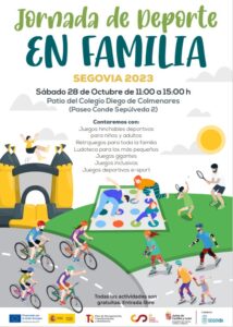 La Dirección General de Deportes de la Junta de Castilla y León y el Servicio Territorial de Cultura, Turismo y Deporte de Segovia organizan, con la colaboración del Ayuntamiento de la capital, la primera jornada ‘Deporte en Familia’, que se desarrollará el próximo sábado, 28 de octubre, desde las once de la mañana hasta las tres de la tarde, en el patio del colegio ‘Diego de Colmenares’ de Segovia. La entrada al centro educativo durante el desarrollo de la jornada es libre y la convocatoria está abierta a la participación de las familias.