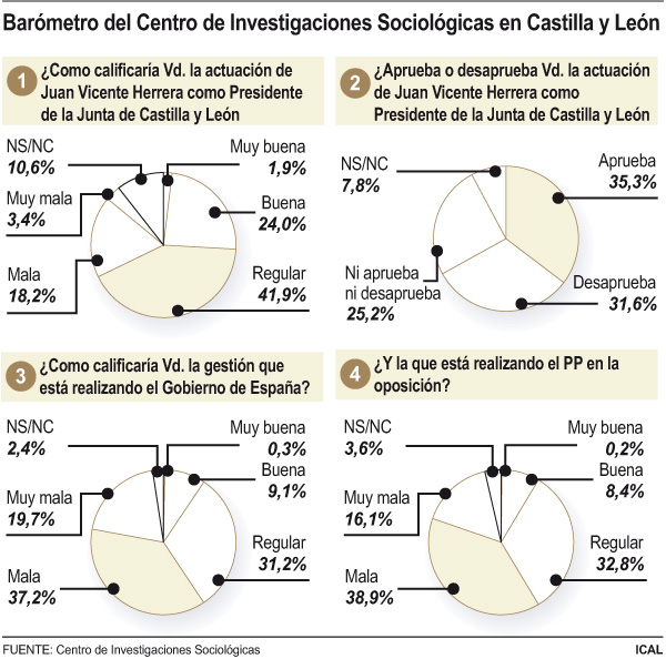 Un 35,3 por ciento de los castellanos y leoneses aprueba la actuación del presidente de la Junta, Juan Vicente Herrera, mientras que otro 31,6 por ciento la suspende, según los datos del Barómetro Autonómico del CIS conocidos hoy que revelan también que la calificación que recibe para la mayoría de la población la gestión de Herrera es regular (un 41,9 por ciento), mientras que para el 25,9 por ciento es buena o muy buena y para un 21,6 por ciento es mala o muy mal.