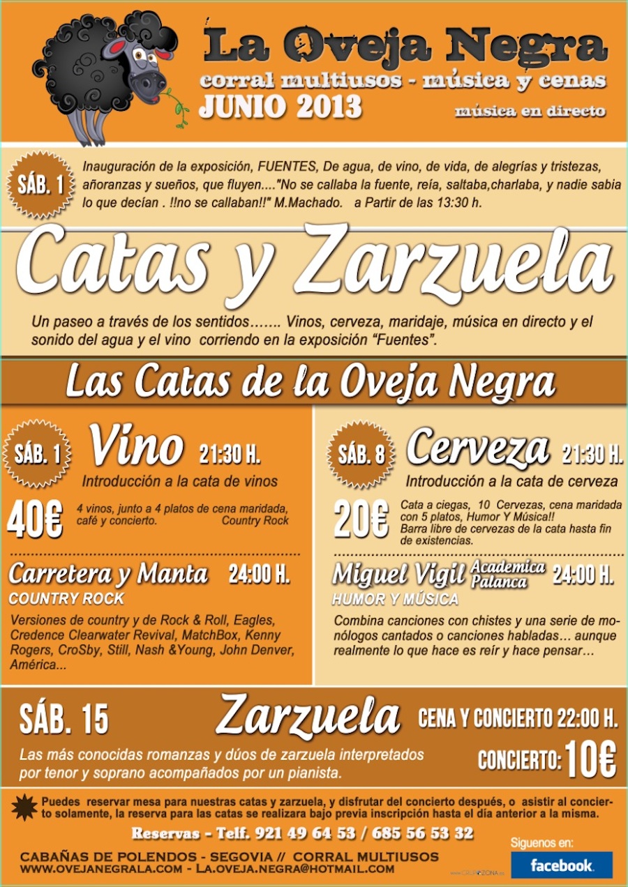 Para el mes de junio, La Oveja Negra, ha apostado por unir los placeres de la vida, buena comida, buena bebida, humor y buena música. Una completa oferta con una cata de vinos, una de cerveza y una cena con zarzuela, junto a la inauguración de la exposición “Fuentes”.