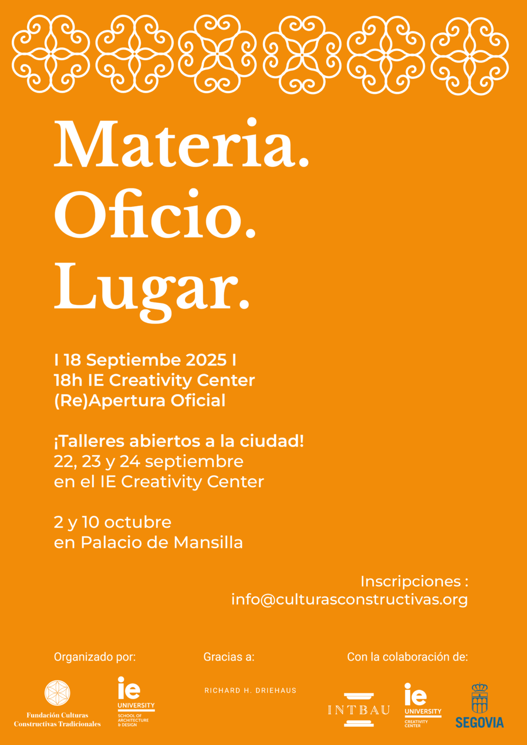 En concreto, este programa, incluye un taller de construcción con fibras vegetales, el 22 de septiembre, a cargo del maestro Manuel Monteserín, en el IE Creativity Center (18.00-20.00 horas). El día 23, el maestro Miguel Ángel Tapia impartirá, también en este mismo espacio, un taller de carpintería artesanal (18.00-20.00 horas). Por su parte, e maestro Elías de Andrés ofrecerá un taller de forja el día 24 de septiembre, en la Casa de la Moneda (16.00-18.00 horas) y la maestra Carolina Alcalá, impartirá, el 2 de octubre, un taller de esgrafiado en el Palacio de Mansilla (11.00-14.00 horas). La programación se completa con un taller de cantería el día 10 de octubre, a cargo del maestro Feliú Martín Farré, también en el Palacio de Mansilla (16.00-19.00 horas).