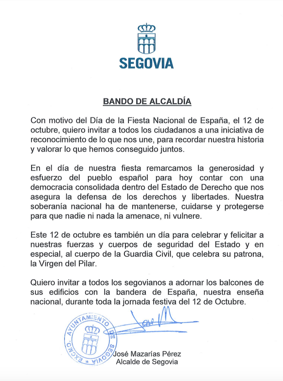 El alcalde de Segovia ha dictado un bando invitando a los segovianos a que coloquen la bandera de España en los balcones de sus casas el 12 de octubre.