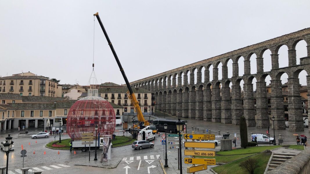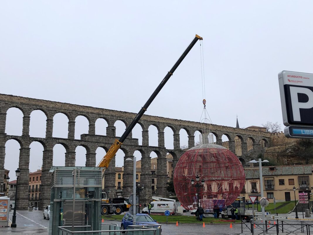 Los operarios trabajan en estos momentos en la colocación de la bola de Navidad que durante el día de ayer fue tumbada por las fuertes rachas de viento.