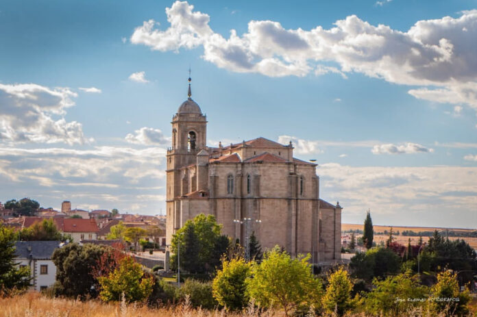 La construcción del templo se atribuye al arquitecto Rodrigo Gil de Hontañón, una de las figuras clave del Renacimiento en España. Su impronta se aprecia especialmente en la fachada occidental, donde destacan dos torres gemelas de planta cuadrada y estilo clasicista. Sin embargo, la simetría quedó incompleta: la torre izquierda nunca llegó a terminarse al igual que una de las capillas proyectadas. La causa fue el declive económico que sufrió la villa tras un periodo de prosperidad vinculado a su estratégica ubicación en rutas comerciales.