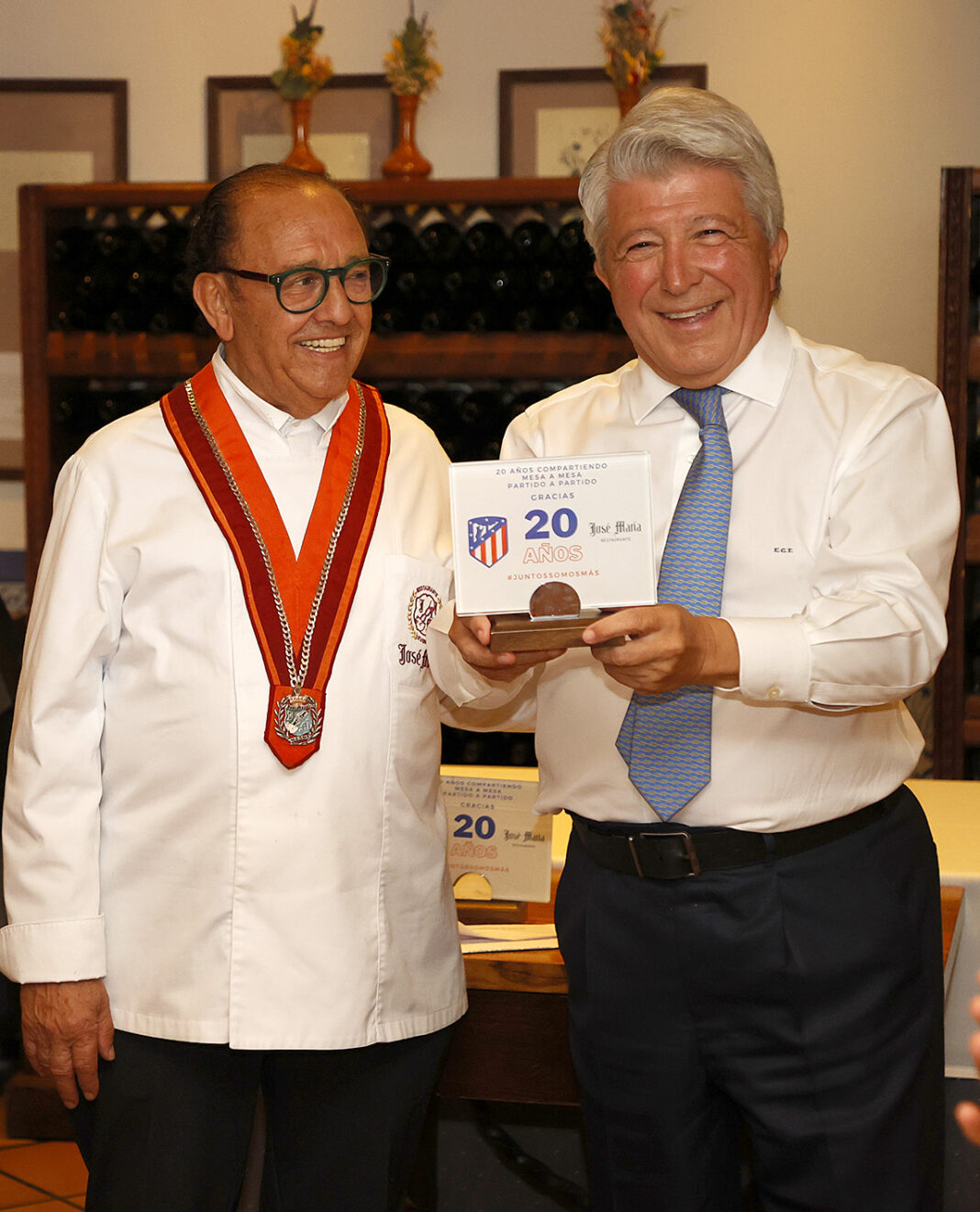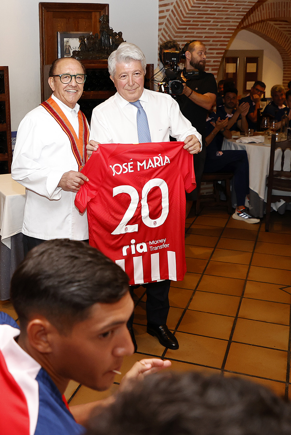 La cena concluyó con un brindis por «la ilusionante campaña que está a punto de comenzar y con la entrega de un obsequio muy especial a José María: una camiseta rojiblanca con su nombre y con el dorsal 20, en conmemoración de los 20 años que en esta pretemporada se cumplen de la primera vez en la cual celebramos nuestra tradicional cena en su restaurante», detallan desde el Atlético de Madrid.