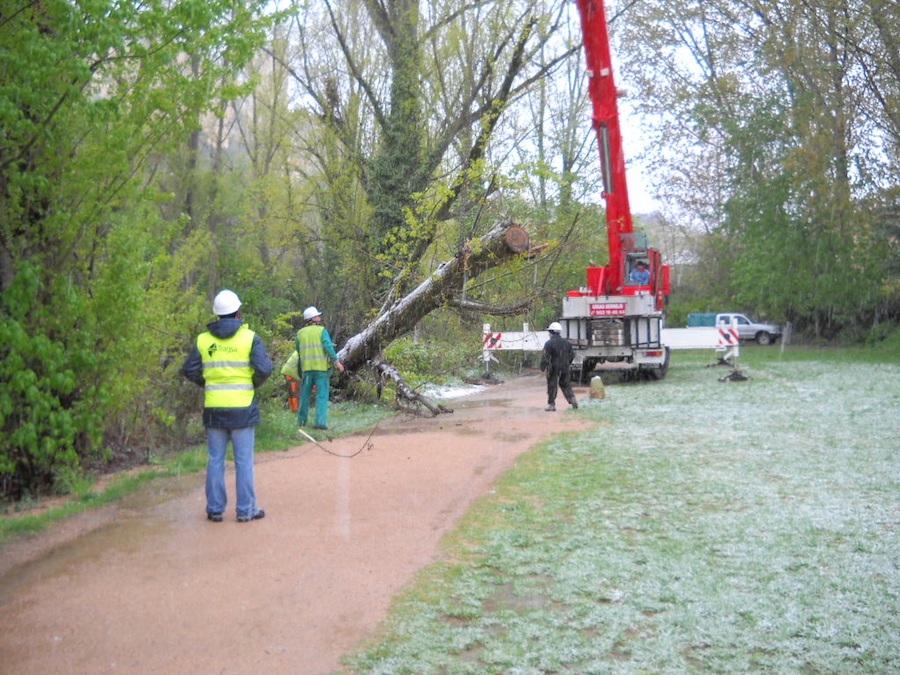 Bajo la nieve. Así ha llevado a cabo la Confederación Hidrográfica del Duero (CHD) los trabajos de retirada de varios árboles caídos en el río Eresma, a su paso por la capital. En colaboración con la Concejalía de Medio Ambiente, a través del Parques y Jardines, la CHD eliminaron los ejemplares ubicados en el cauce del río como consuecuencia de la riada de Semana Santa, según han señalado fuentes del Ayuntamiento de Segovia.