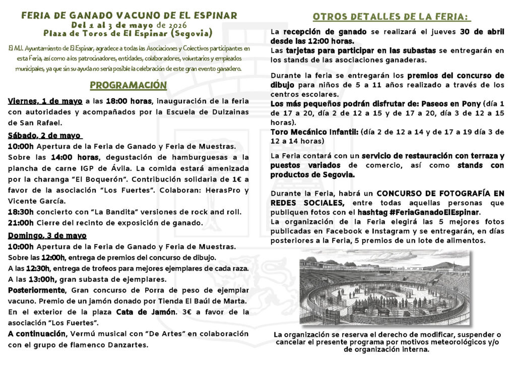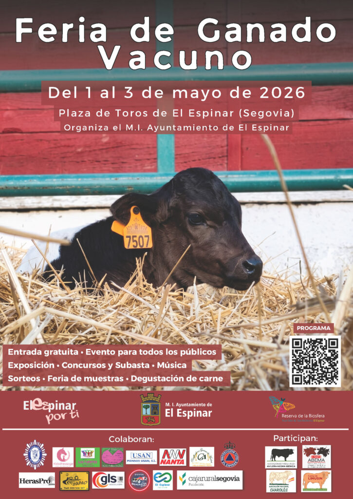 Del 1 al 3 de Mayo el Espinar celebrará la Feria del Ganado Vacuno en la Plaza de Toros. El evento, de entrada gratuita y apto para todos los públicos, se consolida como una de las citas ganaderas y festivas más importantes de la comarca.