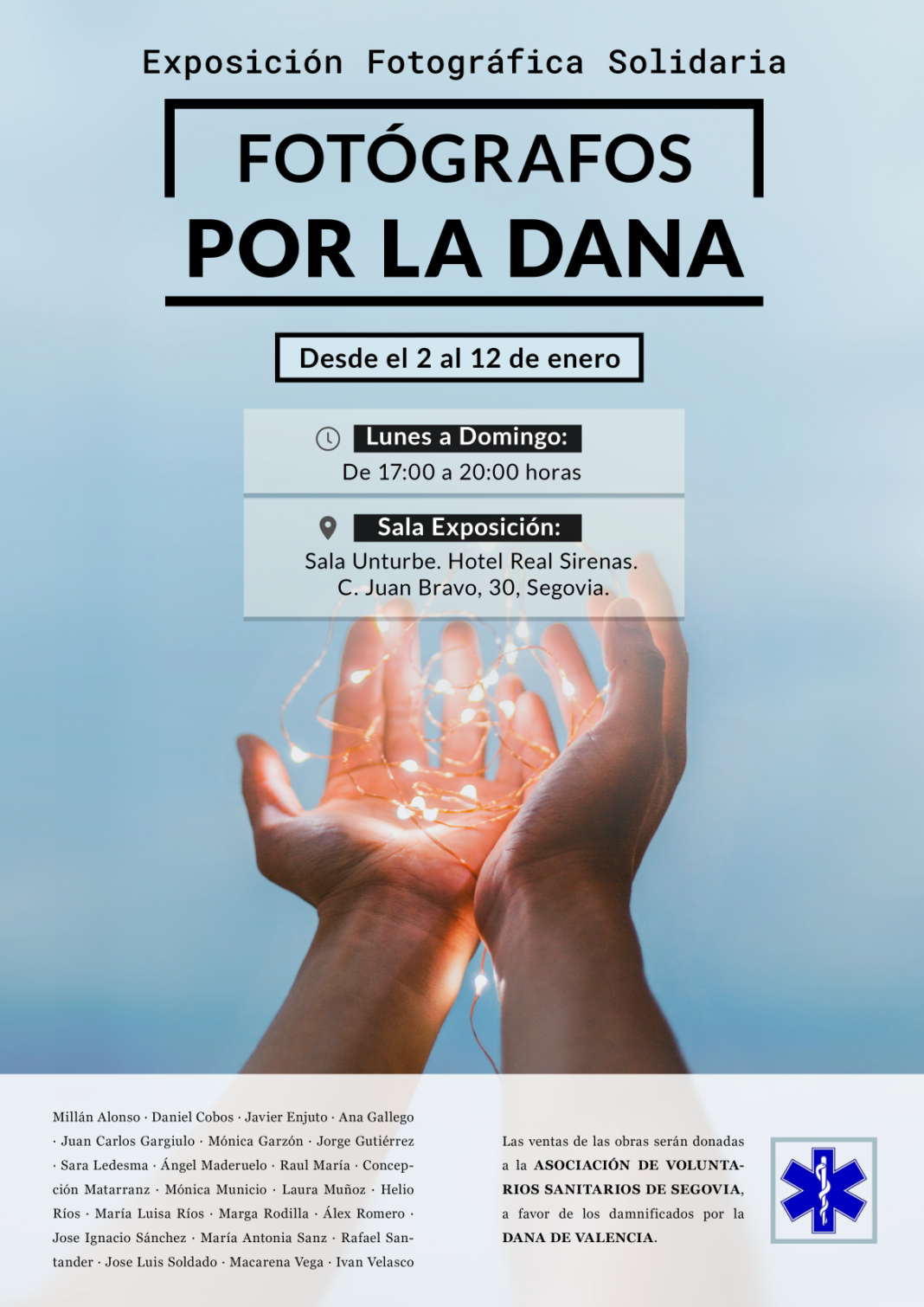 La muestra presentará una exposición fotográfica con obras disponibles para compra, cuyos beneficios se destinarán a la Asociación de Voluntarios Sanitarios de Segovia para apoyar a los afectados por la DANA en Valencia.