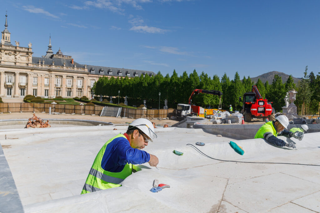 Según el director de Inmuebles y Medio Natural de Patrimonio Nacional, Luis Pérez, se han recolocado cerca de 6.000 piezas de mármol de Carrasa procedentes de las canteras originales. La actuación, que finalizará previsiblemente en junio, permitirá reincorporar la fuente a los tradicionales juegos de agua del conjunto.