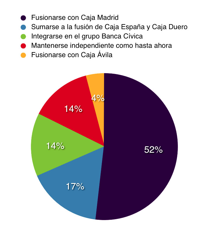 Más de la mitad de los encuestados opina que Caja Segovia debería fusionarse con Caja Madrid (138 personas); Un 17% afirma que sumarse a la fusión de Caja España y Caja Duero es la mejor alternativa (44 personas); Un 14% cree que integrarse en el grupo Banca Cívica puede ser la opción adecuada (37 personas); el mismo porcentaje, un 14% piensa que mantenerse independiente como hasta ahora es la mejor opción (36 personas) y por último, un 4% afirma que la fusión con Caja Ávila es la mejor alternativa.