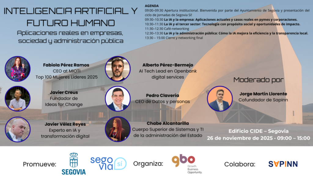 La Inteligencia Artificial y el futuro humano sedan la mano este miércoles, 26 de noviembre, en Segovia en el marco de la estrategia Segovia Sí, organizada por el Ayuntamiento de Segovia. La cita abrirá un nuevo ciclo de jornadas orientadas a impulsar la innovación, el emprendimiento y la transformación tecnológica en la ciudad.