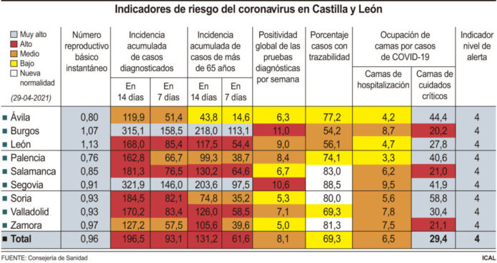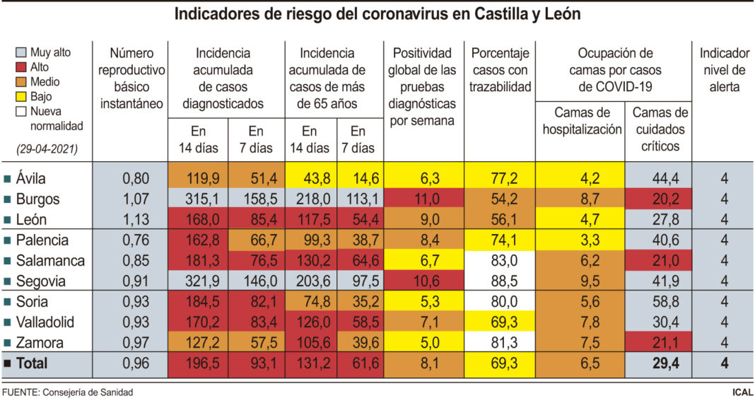 Igualmente, son estas dos provincias son las que registran los números más bajos en cuanto a la incidencia acumulada a siete días, con 57,45 casos por cada 100.000 habitantes en Zamora y 51,38 en Ávila, lo que las sitúa en riesgo medio, al igual que Palencia, con 66,74, casi 30 menos que hace una semana. Ya en riesgo alto se ubican las provincias de León (85,44), Valladolid (83,36), Soria (82,13) y Salamanca (76,54). Mientras, Burgos y Segovia, con 158,53 y 145,95 casos por cada 100.000 habitantes, respectivamente, se sitúan en riesgo muy alto.