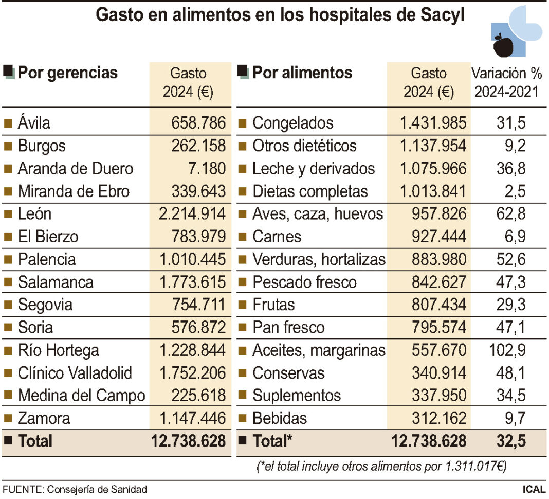 En el conjunto de Castilla y León, el gasto total de los hospitales dependientes de Sacyl en alimentación alcanzó los 12,7 millones de euros en el último ejercicio. De esa cantidad, más de 3 millones corresponden al incremento de gasto registrado desde 2021. Solo en 2024, se invirtieron 337.950 euros en suplementos alimenticios, 19.881 en preparados infantiles, 11.925 en papillas y 43.735 en leche infantil.
