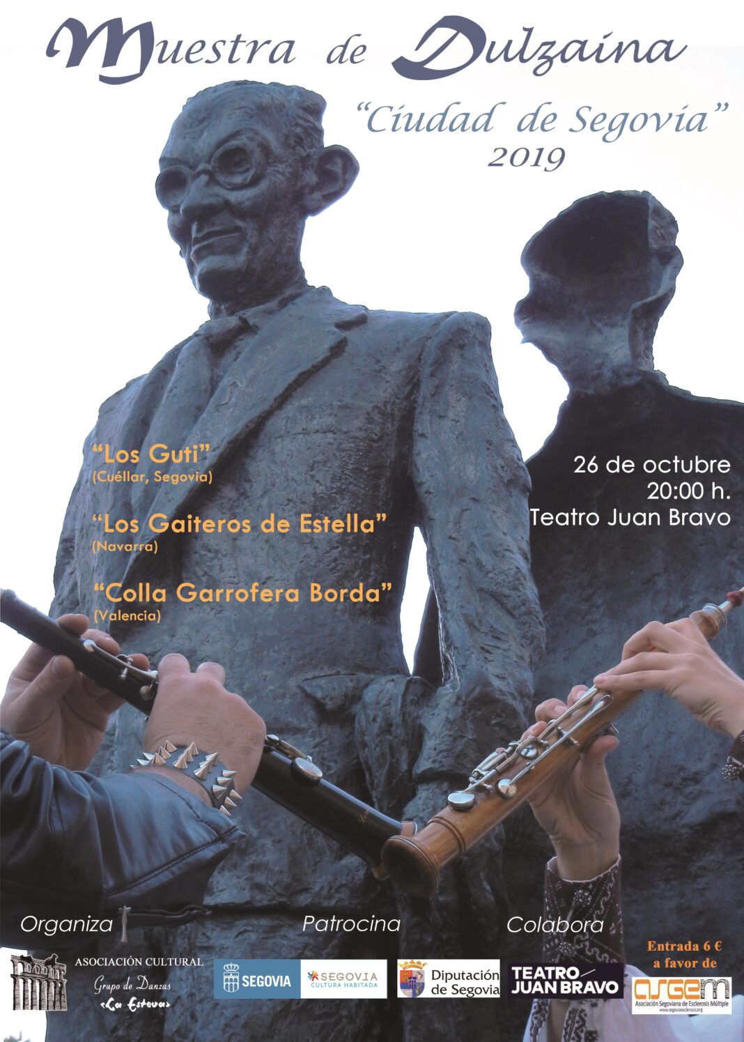 El sábado 26 de octubre a las 20:00 horas se celebrará en el Teatro Juan Bravo la cuarta edición de la Muestra de Dulzaina Ciudad de Segovia, jornada organizada por la Asociación Grupo de Danzas La Esteva de Segovia con el objetivo de reivindicar la actualidad de este instrumento y las tradiciones ligadas a él. Como en ocasiones anteriores, la asociación se ha encargado de diseñar un programa que integra distintas formas de entender la música hecha con dulzaina. En la edición de 2019 se podrá disfrutar de interpretaciones de dulzaina y tamboril castellanos con los hermanos Guti; de gaita navarra con Los gaiteros de Estella; y de la dolçaina y tabalet y otros instrumentos tradicionales valencianos con Colla Garrofera Borda.