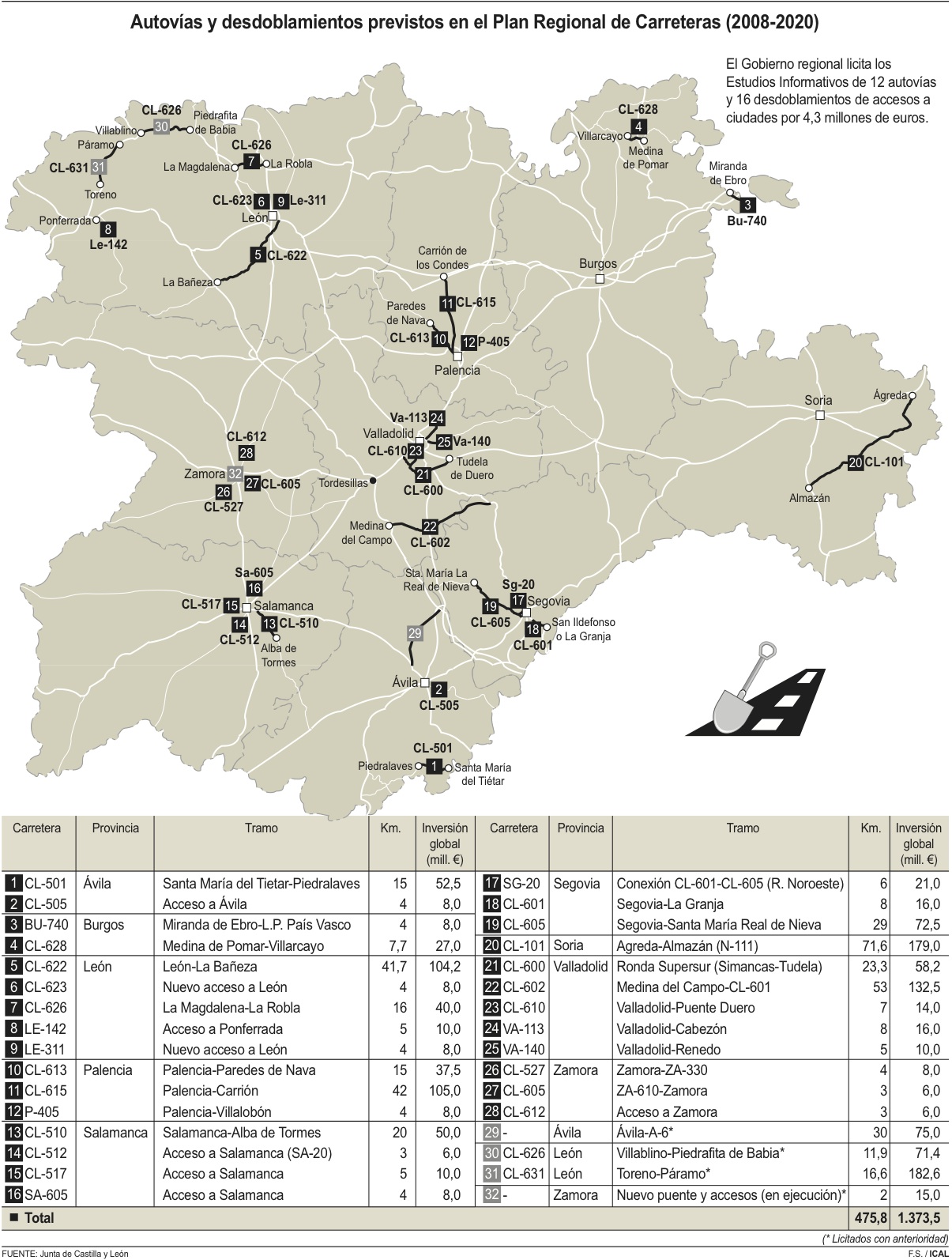 El Consejo de Gobierno de la Junta aprobó la licitación de estos estudios informativos. Además de estas actuaciones, se ha licitado recientemente tres estudios informativos, referidos al acceso a la A-6 en Ávila y la conexión Toreno-Villablino y Villablino-AP-66 en León, así como el nuevo puente de Zamora. Por tanto, en total son 15 autovías y 17 desdoblamientos de acceso a ciudades con un importe global superior a 5,4 millones de euros.