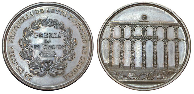 Por su parte, la pieza elegida para los meses de julio y agosto es una medalla a la aplicación de la Escuela Provincial de Artes y Oficios de Segovia, que premiaba a los alumnos de este centro, según la fecha inscrita en anverso, del curso 1892-1893. Está elaborada en bronce con una medida de 45 milímetros de diámetro y 39,07 gramos de peso. El objetivo de labrar esta pieza era dejar para la posteridad ese reconocimiento, una tradición muy del gusto de finales del XIX y que cuenta con varios ejemplos en la ciudad de Segovia.