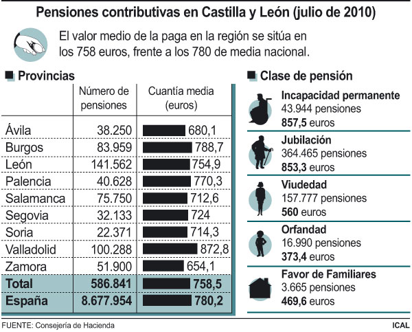 Las pensiones contributivas aumentaron en Castilla y León el 0,7 por ciento en el último año, al situarse en las 586.841 en el mes de julio. Esta cifra representó el 6,8 por ciento del total nacional, que se elevó a 8,67 millones, un 1,6 por ciento más que en el mismo mes de 2009. Por lo que respecta a la cuantía media, se fijó en 758,51 euros, con un aumento interanual del 3,6 por ciento, ligeramente inferior al dato del conjunto del país que se cerró con 780,25 euros de media, un 3,4 por ciento más, según los datos difundidos hoy por la Dirección General de Estadística de la Consejería de Hacienda.