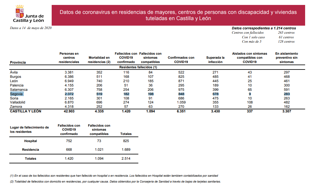 La Junta ha reconocido que el número de fallecidos no es posible darlo con exactitud ya que algunos residentes (sin especificar por las autoridades) fallecen en el Hospital. La realidad es que el número de residentes que ha fallecido diagnosticados como positivos asciende a 381. Una cifra que no ha aumentado en las últimas 24 horas.