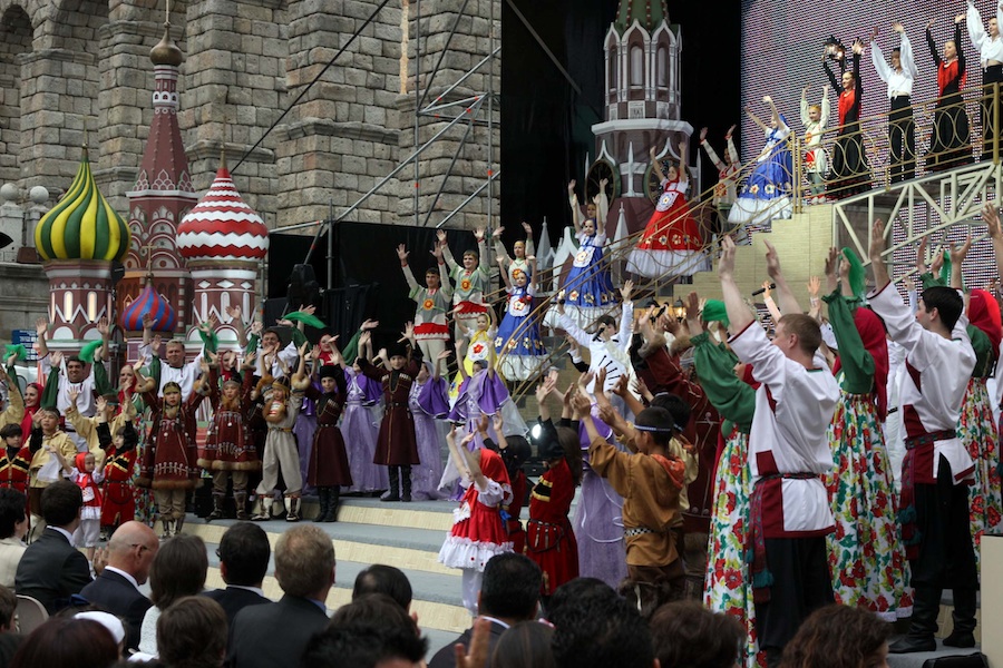 Tras el desfile inaugural a través de la calle Real, desde la Plaza Mayor hasta el Acueducto y sobre este escenario se congregaron cerca de 200 niños de grupos folclóricos y musicales procedentes de toda Rusia, acompañados por algunos grupos infantiles españoles, entre los que se encontraba la Escolanía de la Fundación Don Juan de Borbón. Los artistas rusos, desplegaron sus dotes artísticas mostrando, a las alrededor de 4000 personas que se daban cita en el Azoguejo, bailes típicos de las diferentes zonas del país. La actuación principal ha contado con la participación de los ganadores rusos del Concurso Internacional de Jóvenes Músicos «Cascanueces», así como de alumnos de la Academia de Ballet Ruso de A.Ya. Vaganov, de San Petersburgo. A ellas se sumaron los espectáculos de repúblicas de la federación rusa, como Chechenia, Daguestán u Osetia del Norte. Bailes étnicos, folclore ruso e incluso una representación bailada de las conocidas Matrioskas que hicieron al público disfrutar durante las dos horas y media que duró el espectáculo.