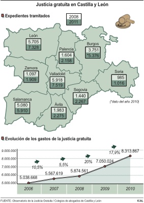 Además de los expedientes, otro dato que demuestra que la crisis ha disparado la demanda de la justicia son los gastos que genera. Mientras en el año 2006 su coste apenas superó los cinco millones de euros en Castilla y León, esta cifra se elevó en 2010 8,31 millones, el 3,2 por ciento del gasto total del país, según se extrae del V Informe del Observatorio de la Justicia Gratuita elaborado por el Consejo General de la Abogacía Española (CGAE). En total, la inversión de las administraciones públicas en la gestión de la asistencia jurídica gratuita durante 2010 en España supusieron 256,6 millones de euros.