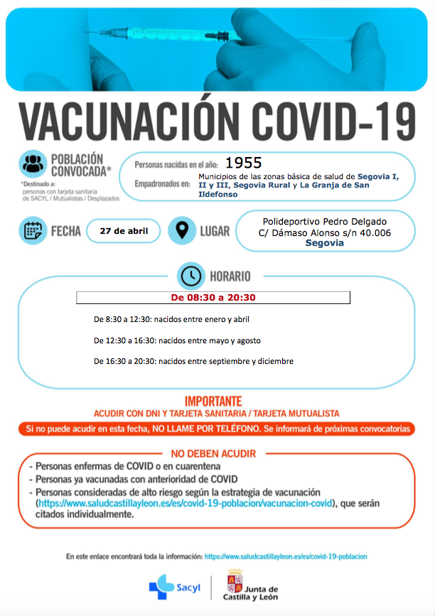 El próximo martes, 27 de abril, la Gerencia de Asistencia Sanitaria de Segovia inicia la vacunación contra la COVID-19 en el pabellón ‘Pedro Delgado’ de la capital a las personas nacidas en 1955. Están convocados a este llamamiento los ciudadanos de ese rango de edad de las tres zonas básicas de salud urbanas, la zona básica de Segovia Rural y la de San Ildefonso-La Granja. Los equipos de vacunación de Atención Primaria permanecerán en el pabellón para administrar los antivirales en horario de 8.30 a 20.30 horas. La fecha y hora en la que deben acudir las personas para recibir la vacuna se ha organizado en función del mes de nacimiento.