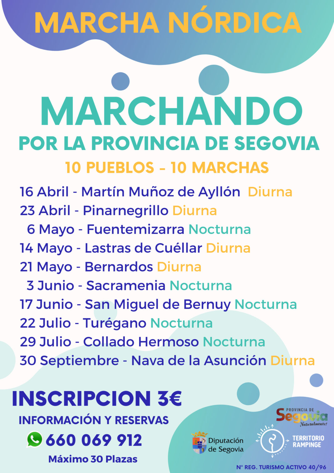 Nuria San Frutos y Otero de Pablos, responsables de la empresa, han señalado que serán cinco marchas diurnas y cinco nocturnas las que compondrán el calendario de esta primera edición de ‘Marchando por la provincia de Segovia’, que comenzará en el domingo 16 de abril en Martín Muñoz de las Posadas y concluirá el 30 de septiembre en Nava de la Asunción, siendo ambas rutas diurnas. A ellas se sumarán las marchas matinales por Pinarnegrillo el 23 de abril, por Lastras de Cuéllar el 14 de mayo y por Bernardos el 21 de mayo. En cuanto a las marchas nocturnas, éstas tendrán lugar el día 6 de mayo en Fuentemizarra, los días 3 y 17 de junio en Sacramenia y San Miguel de Bernuy y, por último, los días 22 y 29 de julio en Turégano y Collado Hermoso.