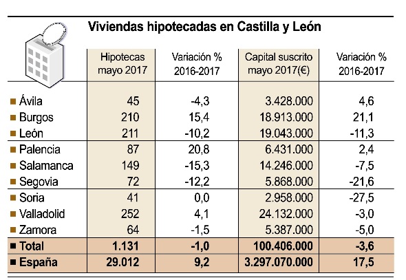 El número de hipotecas constituidas sobre viviendas en Castilla y León se situó en mayo en las 1.131, lo que supone un descenso del 1 % con relación al mismo mes del pasado año y un 29,4 % respecto a abril. Esta caída contrasta con la subida interanual del 9,2% del conjunto del país, donde se contabilizaron 29.012 hipotecas. Además, el capital prestado bajó en la Comunidad en el último año un 3,6 % hasta los 100,4 millones, mientras que en España subió un 17,5 %, hasta los 3.297 millones de euros, según los datos publicados por el Instituto Nacional de Estadística (INE).
