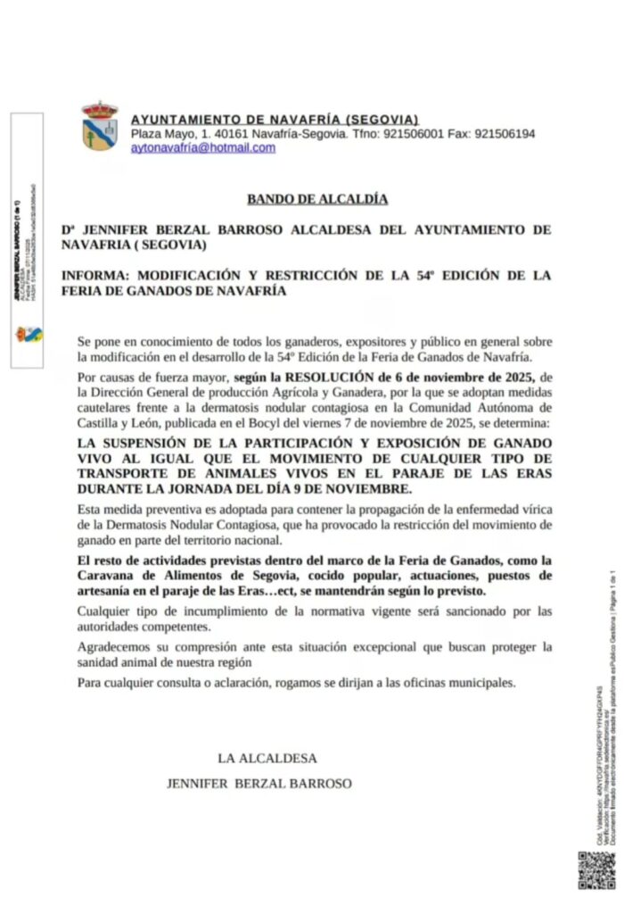 Modificaciones en la LIV Feria del Ganado de Navafría debido a la ampliación de las medidas de prevención frente a la Dermatosis Nodular Contagiosa: el Ayuntamiento de la localidad suspende la exposición ganadera del 9 de noviembre.